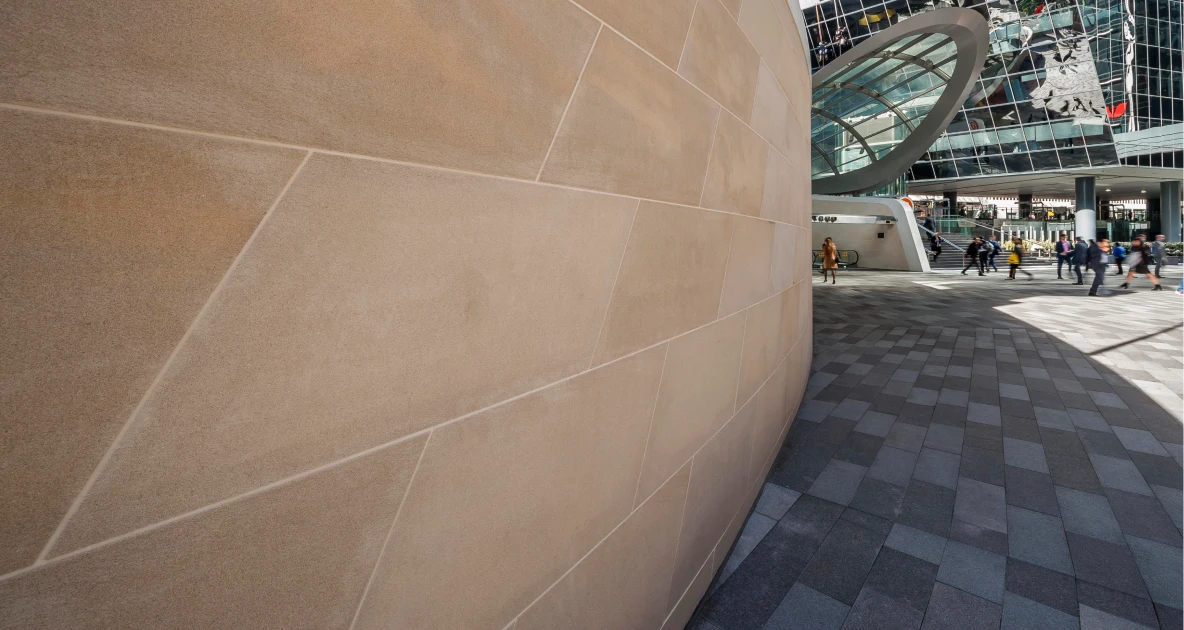 The installation of the curved Gosford Quarries sandstone wall required advanced expertise due to the weight and curved design of the sandstone blocks. Specialised pin-fixing methods were employed to ensure each stone was securely anchored, crucial for maintaining safety and stability. The wall’s curvature added complexity, as every block had to fit precisely within the arc to preserve structural integrity. This careful approach not only guaranteed safety but highlighted the craftsmanship involved in handling such a challenging design.